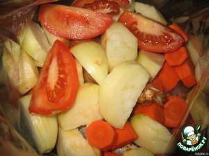 Порезать крупно все овощи и уложить в рукав вместе с кроликом, перемешать...