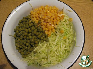 Смешиваем капусту, горошек, кукурузу, огурчики,