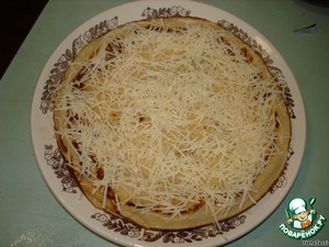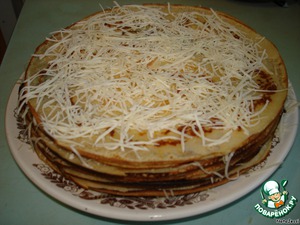 На каждый блинчик натираем сыр. Можно сначала смазывать блинчики сливочным маслом.