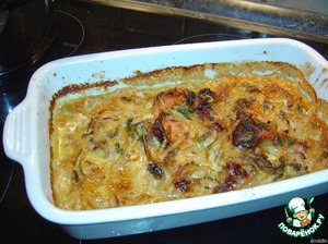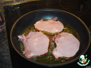1. Лук очистить, разрезать пополам и тонко нарезать. Свининку хорошо обжарить с двух сторон на оливковом масле. Хорошо поперчить и выложить в форму для запекания.