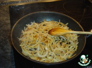 2. В масло, где жарелось мяско, закидываем лук и тоже хорошенько обжариваем. Добавляем сливки, мёд и горчицу и даём закипеть. Посолить и вылить соус на мясо.
