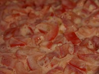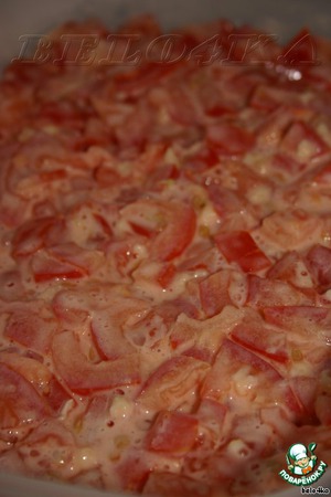 Режем помидоры мелкими кубиками, прямо с выделившимся соком перекдадываем в мисочку, добавляем половину чеснока и 2 столовые ложки майонеза. Перемешиваем. -