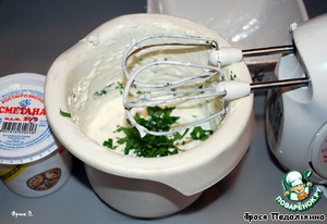 Сметану и сыр взбить миксером, смешать с порезанной петрушкой.