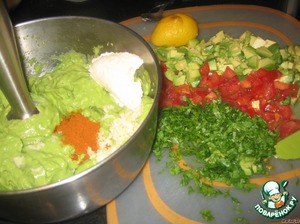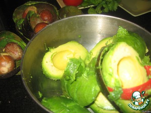 Сразу сбрызнуть соком лимона, чтобы не потемнели авокадо.