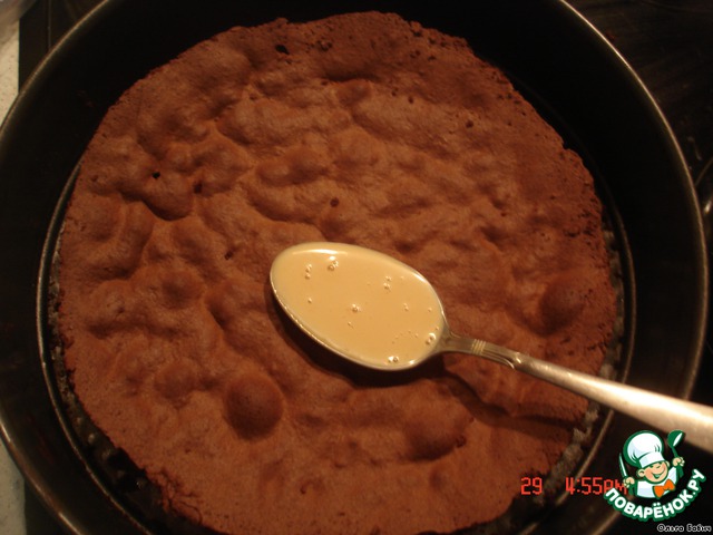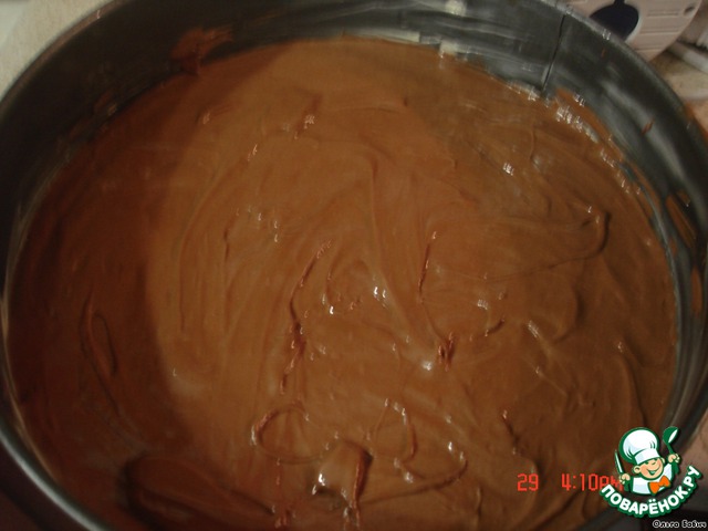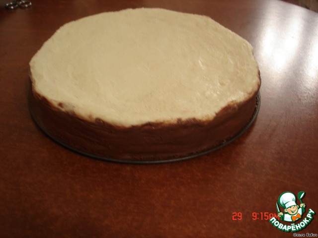 У меня получился кривоват, так как форма была 26 см, и пленка плохо легла, пришлось заглаживать шоколадом