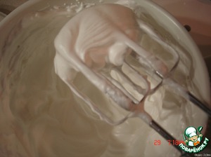 Отдельно взбиваем белки со 130 г сахара до устойчивых пиков и добавляем в массу