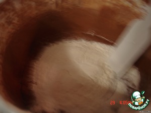 Муку смешать с разрыхлителем и постепенно вводим, перемешивая деревянной ложкой