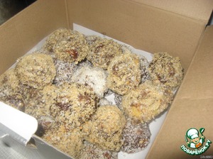 Окунуть каждый шарик в глазурь и обвалять в крошке (у меня это печень+вафли+кокос+миндальные орехи... вобщем все, что было в доме).