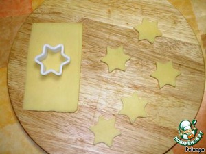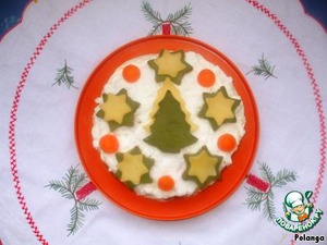 Вырезала с помощью формочек для печенья из зеленого блинчика и кусочка сыра елочки и звезды, из вареной морковки - кружочки.