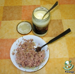 Cмешать тунец с луком, по вкусу добавить майонез.