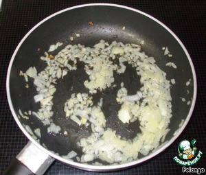 Пока пекутся блинчики, приготовить начинку. Половину луковицы мелко порезать и пожарить на растительном масле до золотистости.