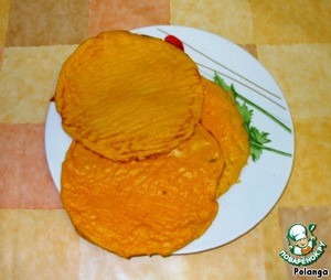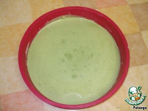 Форму 18 см. застелить бумагой для выпечки. Вылить 1/4 смеси и поставить в разогретую до 180 гр. духовку до готовности (10-12 мин.) Таким образом испечь четыре золотистых блинчика.