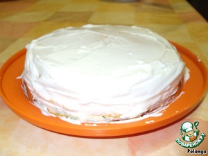 Верх и края торта обмазать смесью из сметаны с майонезoм. Сверху аккуратно распределить взбитые вареные белки.