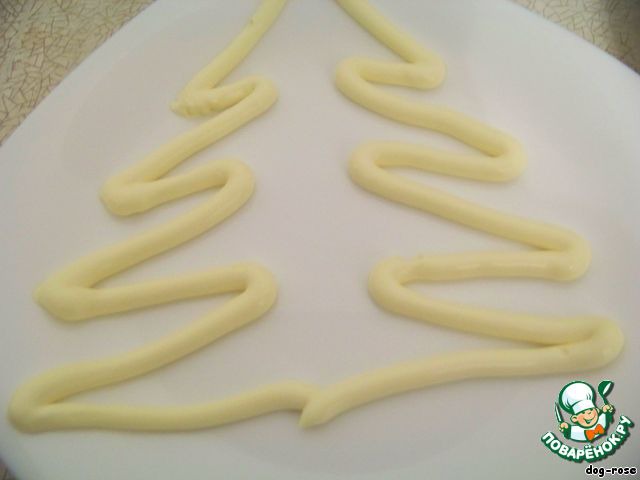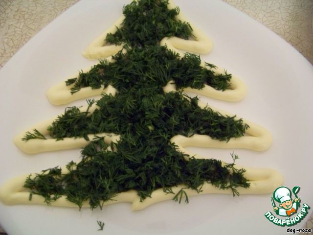 Можно просто посыпать блюдо измельченной зеленью и подать закуску на нем. Это уже будет смотреться эффектно. Но по поводу Нового года можно взять блюдо и нарисовать елочку из майонеза.
