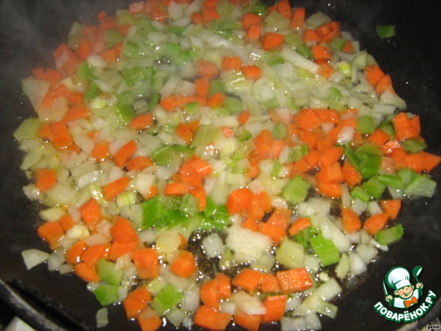 В кастрюльке на растительном масле обжариваем лук, морковь и сельдерей, порезанные мелкими кубиками.