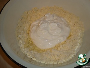 Порубить муку с маргарином в мелкую крошку. Выложить крошку в глубокую миску.
