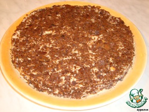 Готовые коржи перемазать заварным кремом. Сверху положить что-нибудь круглое (поднос, блюдо, разделочную доску), прижать хорошенько. Затем смазать верх кремом и обсыпать крошкой. Торт оставить при комнатной температуре на 12-24 ч. для пропитки.