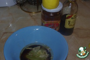 Для маринада - смешаем мёд (1 ст.л.), лимонный сок (1 ст.л.), бальзамический уксус (1 ст.л., неожиданно, да?!! :-D ). Выдавим чеснок. И добавим пару ложек масла. Можно добавить немного соли. Практика показала. -