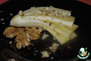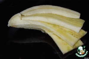 • Всё предельно просто и быстро. Банан разрезаем пополам поперёк. Делаем надрезы вдоль не до конца. Раскрываем веером.