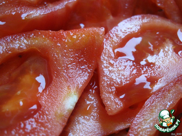 По всей поверхности мяса уложить очищенные и порезанные помидоры.