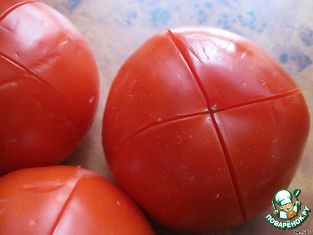 Помидоры надрезать и обдать кипятком, чтоб легко очистились.