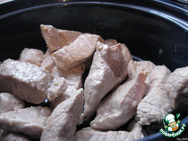 Мясо порезать на крупные куски и обжарить на растительном масле, чтоб схватилось.