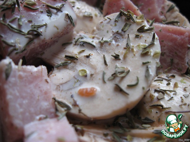 Всё это полить соусом: сливки смешать с кетчупом и добавить соль, тимьян и орегано. Блюдо накрыть крышкой и тушить в духовке 60 минут при t* 220 градусов.
