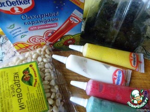 Для украшения тигрёнка я брала сахарную пудру, кедровые орешки, сахарные карандаши и чернослив.