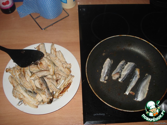 Поджариваем селёдку с обеих сторон (без масла).