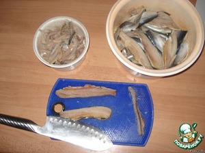 Селёдку разделываем, чистим от костей и делим на две половинки, получаетса очень просто.
