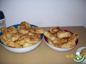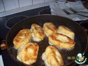 Кусочки теста расплющить пальцами в лепeшки, на середину положить начинку и залепить края. Тесто очень хорошо поддаeтся на все манипуляции, очень приятно с ним работать. Слепить таким образом все пирожки и можно жарить на разогретой с растительным маслом сковороде с обоих сторон до красивого золотистого цвета, ну и, конечно, до готовности.