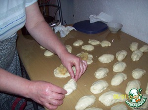 Пальцами сделать из теста лепёшки, положить на середину начинку и залепить пирожки.