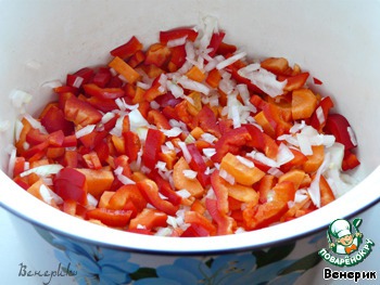 • Пока всё тушиться, нарезаем репчатый лук, болгарский перец, морковь. Положить все овощи в кастрюлю, залить кипящей водой из чайника. Накрыть крышкой и варить на среднем огне.