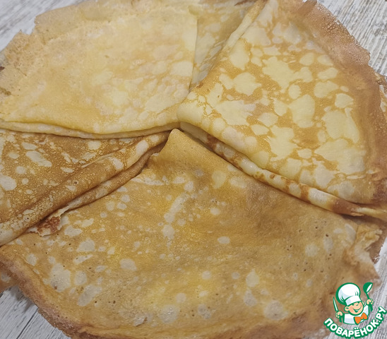 Рецепт этих блинчиков мне рассказала моя коллега по работе и подруга. Я долго с ней спорила о том, что это никакие не блинчики!!! А она улыбалась только и настаивала: попробуй, да попробуй! В общeм ее блинчики мне не давали покоя два дня. И вот, в Рождественский вечер, я по семейной ежегодной традиции пеку блины с разными начинками - кумовьям и крестничкам к Рождественскому ужину. В общeм решилась таки на ее рецепт... Неописуемо насколько блинчики получились нежными... Таких в своей жизни я нигде не пробовала... Сравнить можно только лишь с поцелуем любимого... Решайтесь. Попробовав один раз, оставите этот рецепт в своём меню навсегда! (На сайтах не ищите - таких нет, вчера перешерстила просторы интернета))