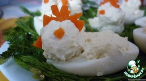 Готовила в первый раз. Конечно раньше фаршировала яйца, но обычным сыром, а теперь решила попробовать с плавленым сырком. Всем понравилось. На конкурс "Gorenje:новогодняя композиция".