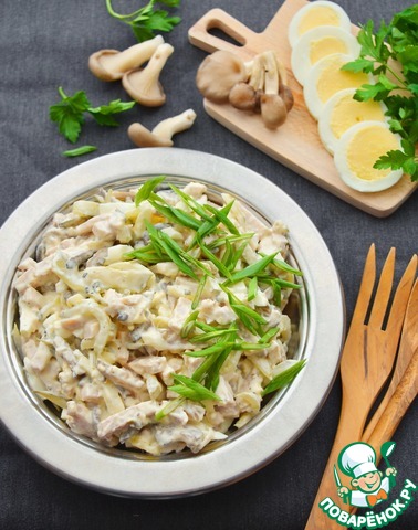 Вкусный, сытный и незатейливый салат. Не могу сказать, что вызвал восторг, но вполне имеет место быть как быстрый вариант для нежданных гостей, например. Правда, у меня не оказалось опят, я сделала с вешенками (я их поджарила и слегка подмариновала). С опятами будет поинтересней. Не хлопотно и вкусно.