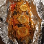 Разложить на поверхности стола фольгу - столько, чтоб хватило завернуть рыбину полностью. Рыбу натереть солью и специями - снаружи и внутри, часть овощей использовать для "подушки" для рыбы, остальными начинить её. Сверху разложить колечки лимона и присыпать специями еще раз.