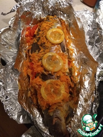 На рыбину весом в 1,2 кг у меня ушло две крупные луковицы, корешок петрушки (из заготовок из морозильника), пучок зеленого лука и крупная морковь.