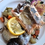 Час на более интенсивном или 1,5 часа на небольшом огне (у меня, увы, нет градусника в духовке, так что все интуитивно) - и блюдо готово! Рыба... сама подсказывает свою готовность - запахом, одуряющим голодные в предвкушении желудки, его слышно и в самых дальних комнатах, и в подъезде - таким неожиданным образом можно пригласить соседей на обед!