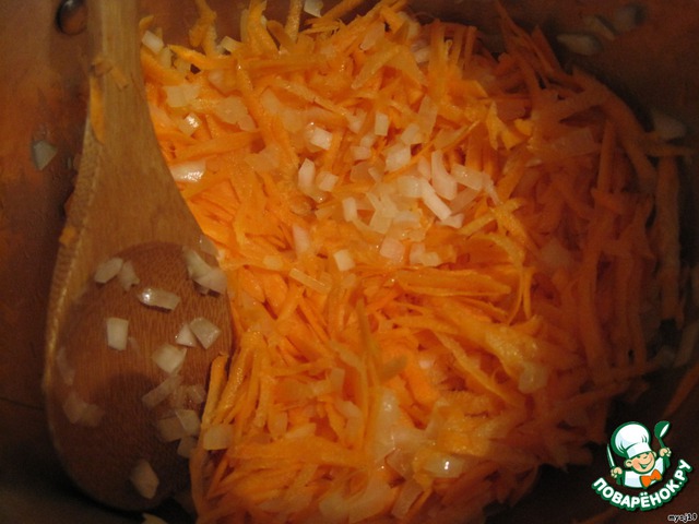 Часа через полтора начинаем готовить овощную заправку. Мелко нарезаем лук и пассируем в толстостенном ковшике на смеси растительного и сливочного масла 1:1, туда же добавляем натертую на терке морковь.