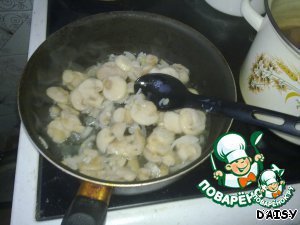 Крупную луковицу режем тонкими полукольцами и вместе с половиной упаковки резанных шампиньонов отправляем жариться в течении 5 минут. -
