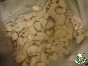 обжаренное мясо укладываем на лук, солим, перчим, добавляем специи