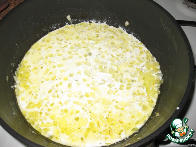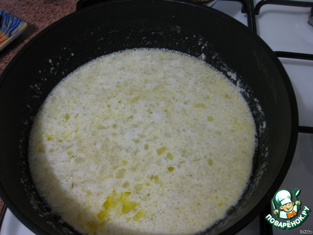 Влить 120-150 мл сливок. В принципе, жирность не очень важна. Я брала 20%-ные. |