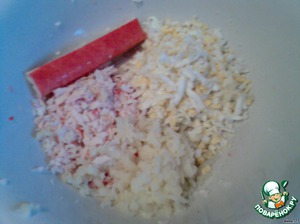 Натереть на тёрке крабовые палочки, яйца, варёный картофель, смешать с майонезом.