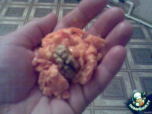 В шарик из моркови вставляем четвертинку грецкого орешка.