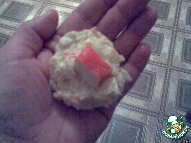 В салатик из морской капустки я положила по кусочку сыра. В шарик из крабовых палочек, яиц и картофеля - кусочек крабовой палочки или то, что вам захочется, это дело вкуса каждого.