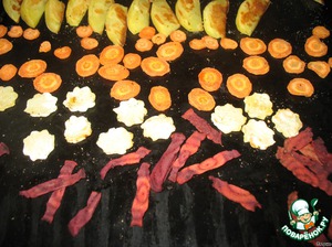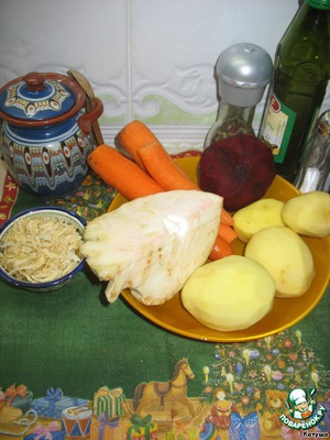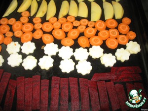 Поставить в горячую 200*С духовку на 30-40 минут. Плиты у всех разные, нужно проверять готовность индивидуально: проколоть картофель ножом, он должен быть мягкий, не скрипеть. Сельдерей готовится очень быстро. Следите, чтоб свекла не пересохла.