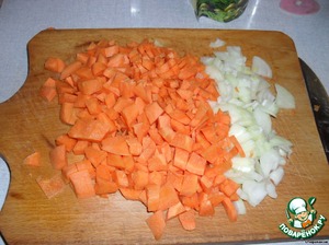 Сестре я доверила резать лук и морковь на дольки (лучше не мельчить) и мясо на кубики, и все это нужно выложить на низ противня (я не смазывала противень, т. к. гусь достаточно жирный)