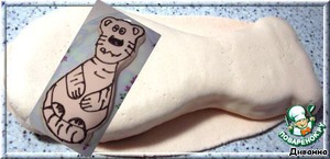 Раскатываем пласт не тоньше одного сантиметра (можно 1,5-2 см) и вырезаем по шаблону в форме тигра. На следующий пласт - тигра надо зеркально перевернуть.