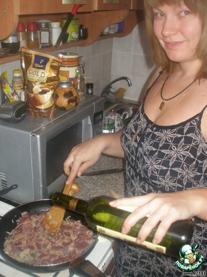 Обжаривала я все сама! На оливковом масле быстро обжарила лук, добавила печенку и вино. Потушила все очень недолго - 2-3 минутки.